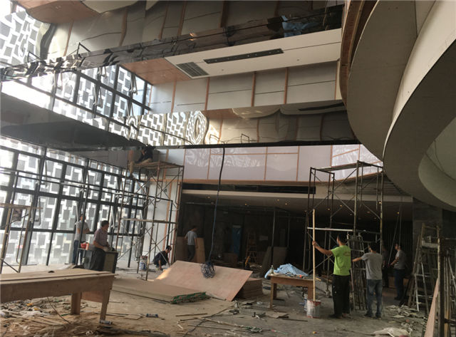 3、酒店:部份樓層客房內(nèi)天棚、墻紙、門、隔斷、木柜,鏡面已完成,準(zhǔn)備鋪設(shè)地毯。外立面幕墻、主入口雨篷施工完成。