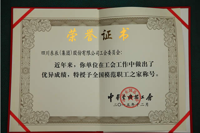 2016年6月15日,東辰集團工會獲“全國模范職工之家”榮譽稱號授牌儀式在公司舉行,受全國總工會委托,綿陽市總工會黨組書記、常務(wù)副主席彭時榮向公司工會授牌,涪城區(qū)委常委、區(qū)總工會主席趙越,區(qū)總工會黨組書記、常務(wù)副主席陳竹等領(lǐng)導(dǎo)出席了儀式,東辰集團總經(jīng)理趙賢政主持了儀式。