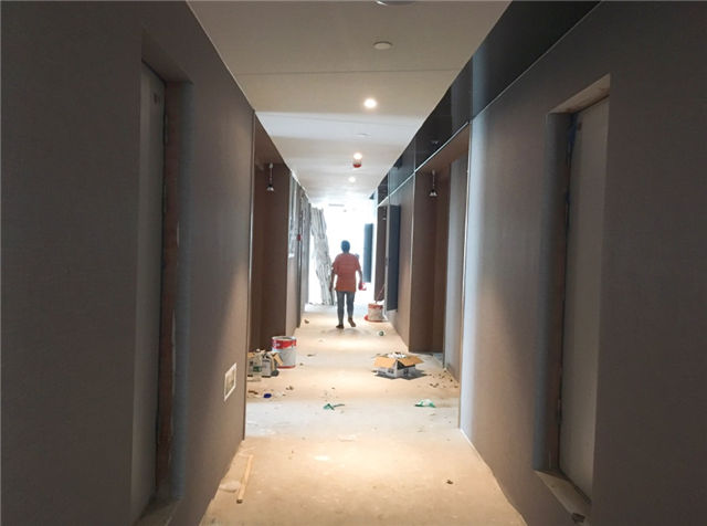 3、酒店:各樓層客房內天棚、墻紙、木門、隔斷、衣柜,鏡面、地毯、衛(wèi)生潔具、洗浴配件已安裝完成,床和家具正在安裝中。外立面幕墻、主入口雨篷施工完成。